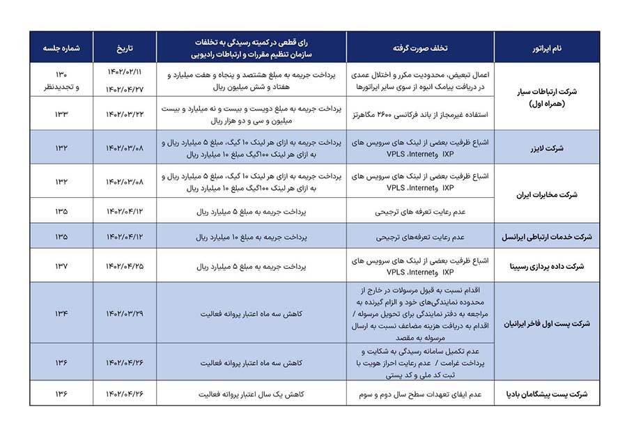 براساس آنچه در سایت رسمی سازمان تنظیم مقررات و ارتباطات رادیویی آمده، همراه اول، شرکت مخابرات ایران، ایرانسل، لایزر، داده‌پرازی رسپینا، پست اول فاخر ایرانیان و پست پیشگامان بادپا به پرداخت جریمه نقدی یا کاهش مدت اعتبار پروانه خود جریمه شده‌اند.