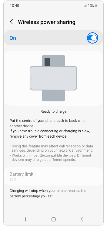 سامسونگ برای رهایی شما از نگرانی خاموش شدن دستگاه‌های هوشمندتان، سری گلکسی خود را به قابلیت شارژ بی‌سیم معکوس (Wireless PowerShare) مجهز کرده است. این قابلیت که تنها در گلکسی‌های سری S و Z در دسترس است؛ گوشی شما را به یک پلتفرم شارژر بی‌سیم تبدیل کرده و به سایر دستگاه‌های دارای گواهی Qi امکان می‌دهد با دستگاه شما شارژ شوند. برای این کار، به هیچ کابلی نیاز نیست و فقط باید دستگاه دوم را بالای دستگاه خود قرار دهید. طبق مراحل زیر، این قابلیت را فعال کنید تا بتوانید توسط آن، دستگاه‌های دیگر خود را شارژ کنید.