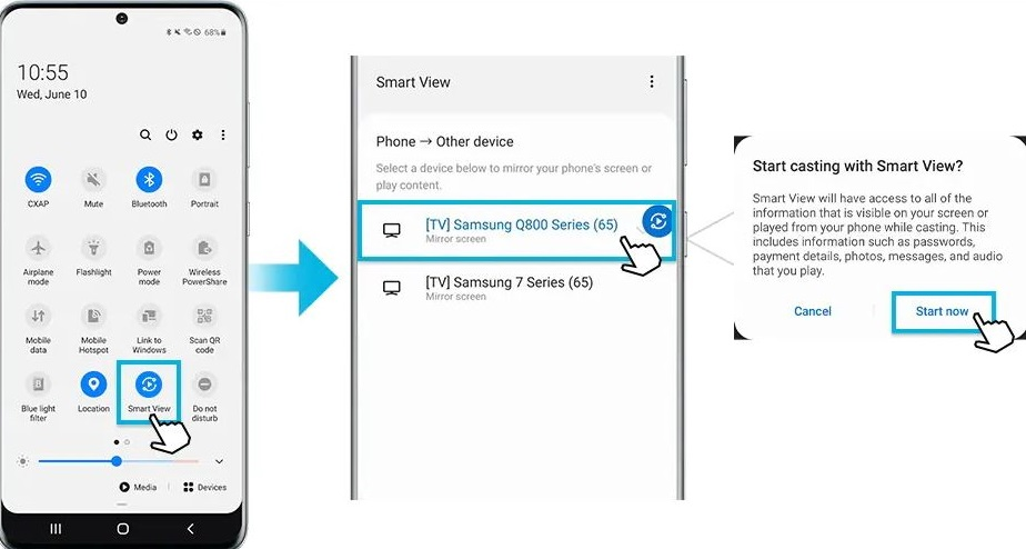 •    برای شروع ارسال محتوا با نمای هوشمند (Smart View)، باید گزینه اکنون شروع کنید (Start Now) را بزنید تا محتوای گوشی روی تلویزیون به نمایش درآید.