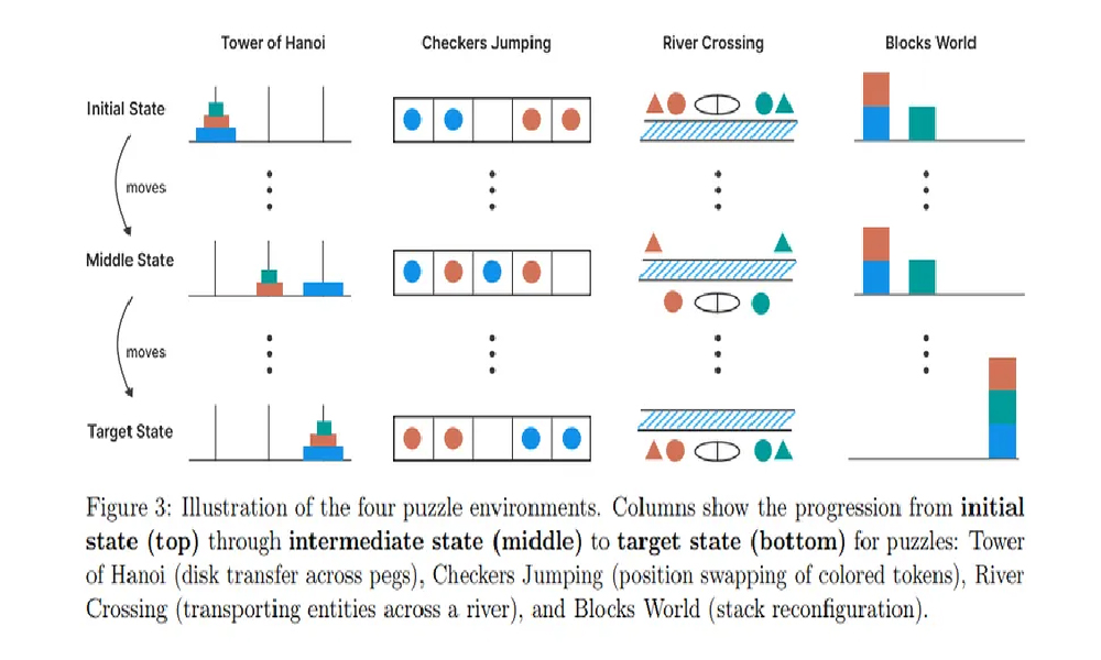 برای بررسی بیشتر این مسائل، نویسندگان این مطالعه، چهار پازل کلاسیک را به مدل‌های جامع و استدلالی «هوش مصنوعی» دادند. آنها سپس با افزودن اجزای بیشتر به پازل‌ها، پیچیدگی را در سه سطح، آسان، متوسط و سخت تنظیم کردند. در وظایف با پیچیدگی پایین، مدل‌های عمومی بهتر از مدل‌های استدلالی عمل کردند، زیرا بدون صرف هزینه‌های محاسباتی اضافی زنجیره استدلال، به پاسخ درست رسیدند. با افزایش پیچیدگی، عملکرد مدل‌های استدلالی بهبود یافت، اما در مواجهه با مسائل بسیار پیچیده، عملکرد هر دو گروه به صفر، سقوط کرد.