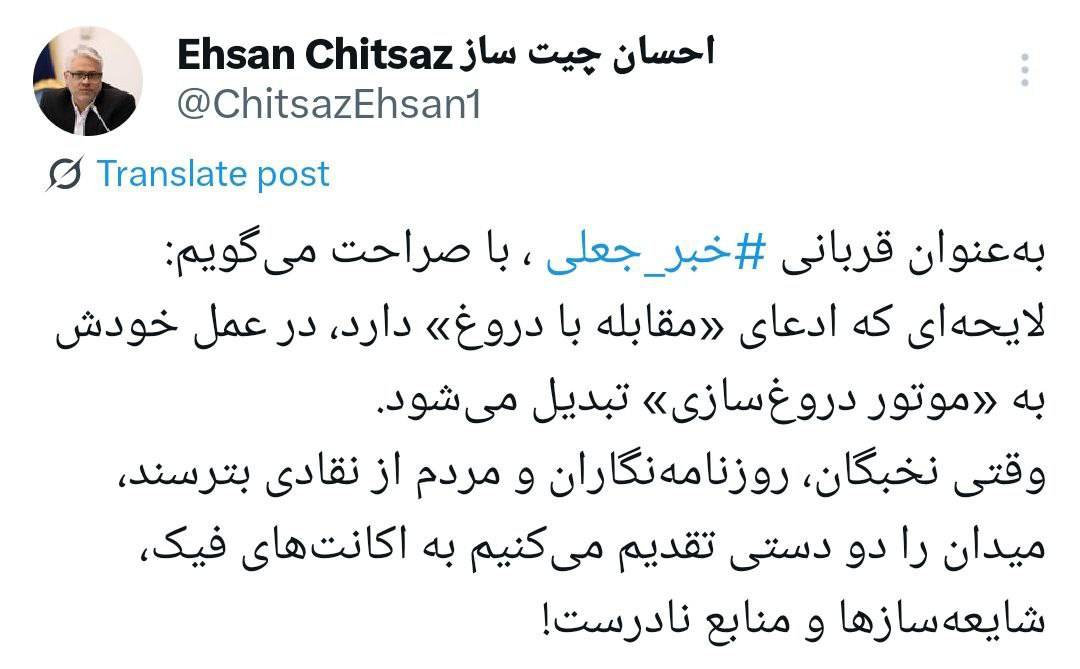 احسان چیت ساز معاون سیاستگذاری و برنامه ریزی توسعه فاوا و اقتصاد دیجیتال، در شبکه اجتماعی در خصوص لایحه مقابله با انتشار محتوای خبری خلاف واقع در فضای مجازی گفت: بهعنوان قربانی خبر جعلی، با صراحت میگویم: لایحهای که ادعای «مقابله با دروغ» دارد، در عمل خودش به «موتور دروغسازی» تبدیل میشود.