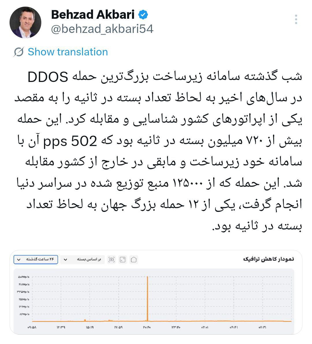 به گزارش شبکه خبری ICTPRESS، بهزاد اکبری مدیرعامل شرکت ارتباطات زیرساخت با انتشار پستی در شبکه اجتماعی ایکس اظهار داشت: شب گذشته سامانه زیرساخت بزرگ‌ترین حمله DDOS در سال‌های اخیر به لحاظ تعداد بسته در ثانیه را به مقصد یکی از اپراتورهای کشور شناسایی و مقابله کرد.