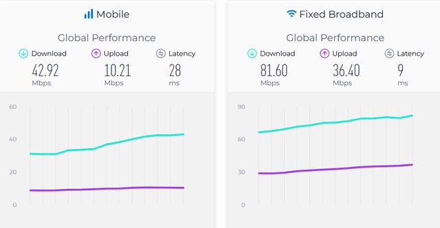 طبق آخرین آمار منتشر شده در وب سایت اسپیدتست، تا ماه ژوئن۲۰۲۳، میانه جهانی سرعت دانلود اینترنت موبایل ۴۲.۹۲ مگابیت برثانیه، میانه جهانی سرعت آپلود اینترنت موبایل ۱۰.۲۱ مگابیت بر ثانیه و تأخیر ۲۸میلی ثانیه است. در حوزه اینترنت ثابت نیز میانه جهانی سرعت دانلود ۸۱.۶۰ مگابیت بر ثانیه، میانه جهانی سرعت آپلود ۳۶.۴۰ مگابیت برثانیه و تأخیر ۹ میلی ثانیه است.