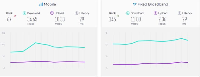 ICTPRESS - سایت جهانی اسپیدتست در آخرین آمار خود از رشد یک رتبهای سرعت اینترنت ثابت و افت ۲ رتبهای اینترنت سیار ایران خبر داد.