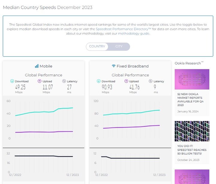 به گزارش شبکه خبری ICTPRESS، جدیدترین گزارش وب سایت اسپید تست نشان می‌دهد در آخرین ماه ۲۰۲۳ میلادی، میانه سرعت اینترنت موبایل جهان ۴۹.۲۵ و میانه سرعت اینترنت ثابت آن ۹۰.۹۳ مگابیت برثانیه بوده است.