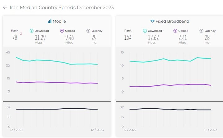 همچنین بر اساس گزارش اسپید تست در دسامبر ۲۰۲۳ میلادی میانه سرعت اینترنت موبایل ایران ۳۱.۲۹ مگابیت برثانیه بوده و جایگاه آن نسبت به نوامبر (ماه قبل) با ۳ پله سقوط رده ۷۸ اعلام شده است. در بخش اینترنت ثابت نیز میانه سرعت اینترنت کشور ۱۲.۶۲ مگابیت بوده و جایگاه آن در رده بندی کشورهای جهان نسبت به ماه قبل بدون تغییر، رتبه ۱۵۴ است.