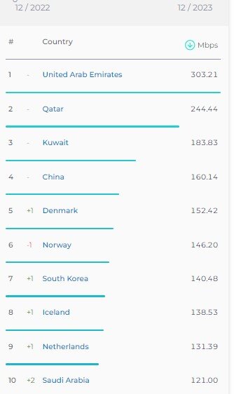 در رده بندی اسپید تست از کشورهایی با بیشترین میانه سرعت اینترنت موبایل در سراسر جهان در دسامبر ۲۰۲۳ میلادی به ترتیب امارات متحده عربی (۳۰۳.۲۱ مگابیت برثانیه)، قطر (۲۴۴.۴۴ مگابیت برثانیه)، کویت (۱۸۳.۸۳ مگابیت برثانیه) و چین (۱۶۰.۱۴ مگابیت برثانیه) بوده است. این کشورها رده یک تا چهار را به خود اختصاص داده اند و جایگاه آنها در فهرست اسپید تست نسبت به ماه نوامبر تغییری نکرده است.