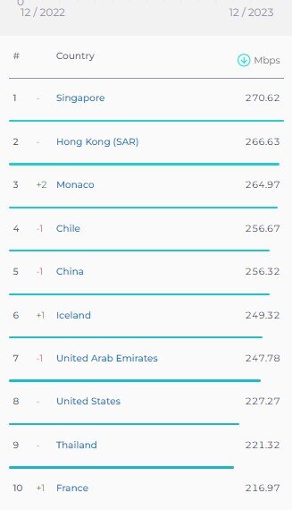 در بخش رده بندی اینترنت ثابت در دسامبر ۲۰۲۳ میلادی، به ترتیب کشورهای سنگاپور (۲۷۰.۶۲ مگابیت برثانیه) و هنگ کنگ (۲۶۶.۶۳ مگابیت برثانیه) در رده‌های یکم و دوم قرار دارند که جایگاه آنها نسبت فهرست ماه قبل از آن تغییری نکرده است.
