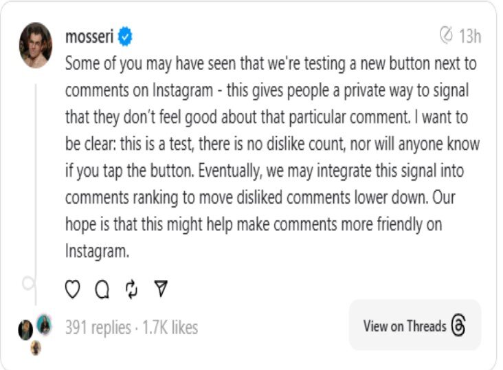 موسری در شبکه اجتماعی تردز نوشت: این گزینه راهی خصوصی برای افراد فراهم می کند تا نشان دهند درباره یک کامنت خاص احساس خوبی ندارند. امیدواریم این اقدام سبب شود کامنت ها در اینستاگرام دوستانه تر شوند.