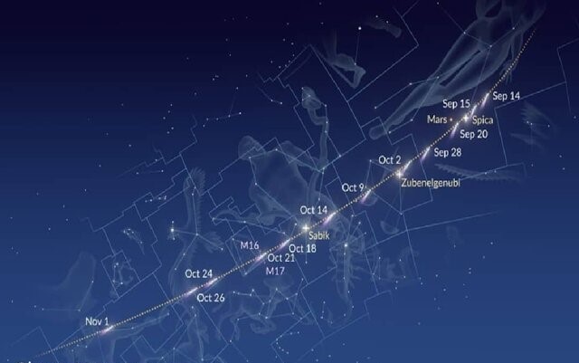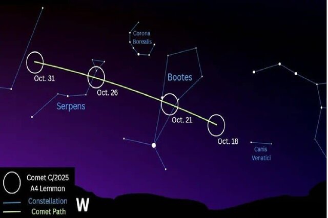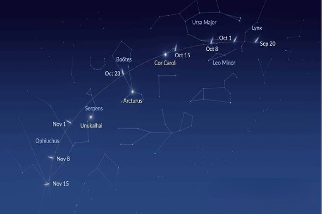 عتیقی ادامه داد: ماه گذشته دنبالهدار Lemmon A6 به سرعت روشنتر شد و نزدیک شدن به خورشید باعث افزایش فعالیت و درخشش آن شد. این روشن شدن، احتمال دیدن آن را حتی بدون ابزار در این شبها، آن هم در مناطق تاریک و عاری از غبار و آلودگی نوری افزایش داده است. در نزدیکترین گذر این دنبالهدار از نزدیک زمین، جای آن در آسمان تغییر کرده و در افق شامگاهی به سمت افق شمالغرب، در زمینه صورت فلکی گاوران (عوّا - Bootes) که به آن بادبادک هم میگویند، قرار دارد؛ صورت گاوران بین صور فلکی خرس بزرگ (دُباکبر) و خوشه (سنبله) جا خوش کرده است و در ادامه مسیر از زیر صورتفلکی بزرگ مار (Serpens) عبور خواهد کرد، به نحوی که شاید این دنبالهدارهای زیبا را با چشم غیرمسلح و یا دوربین دوچشمی و تلسکوپ کوچک بتوانید ببینید.