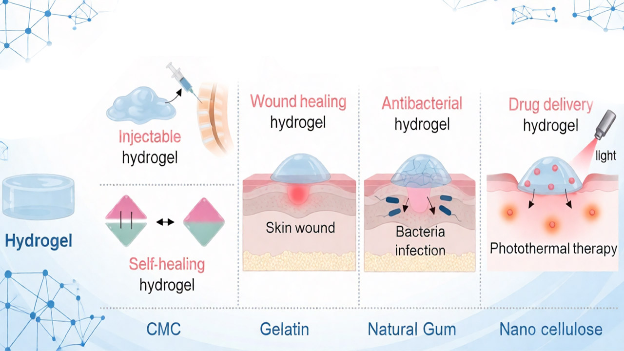 هیدروژل‌های زیست‌پایه، شبکه‌هایی سه‌بعدی از پلیمرهای طبیعی هستند که توانایی بالایی در جذب و نگهداری آب دارند. این ویژگی باعث می‌شود محیطی مرطوب و مناسب برای ترمیم زخم ایجاد شود؛ محیطی که برای مهاجرت سلول‌ها، تکثیر، و بازسازی بافت حیاتی است. پلیمرهایی با منشاء طبیعی، مانند صمغ‌های گیاهی، سلولز و ژلاتین، به‌دلیل زیست‌سازگاری بالا، سمیت پایین و قابلیت تخریب کنترل‌شده، توجه بسیاری از پژوهشگران را به خود جلب کرده‌اند.