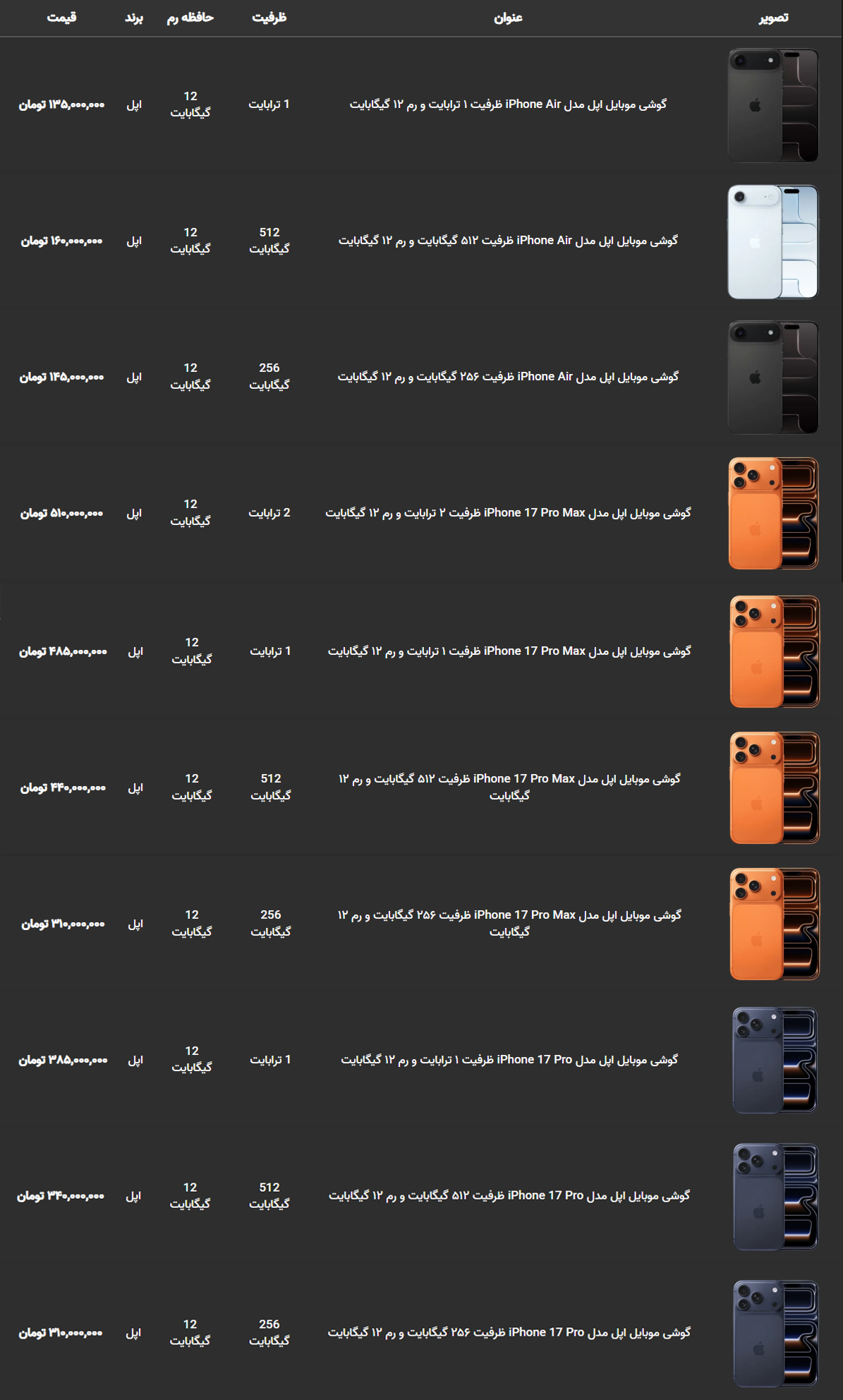 ICTPRESS - قیمت آیفون ۱۷ پرو مکس به نیم میلیارد تومان رسید. جدیدترین لیست قیمت انواع گوشی های موبایل اپل منتشر شد.