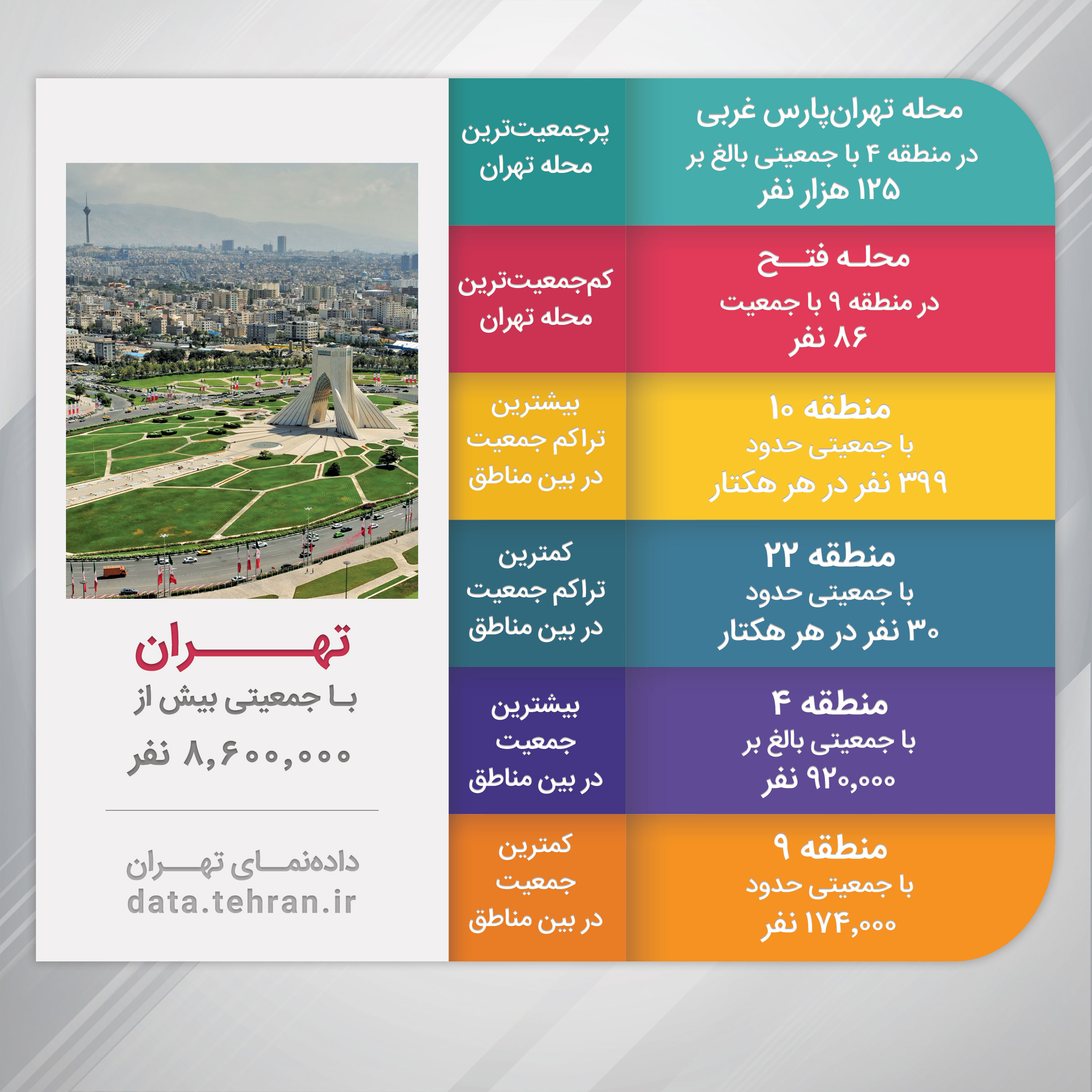 ICTPRESS-محله فتح در منطقه ۹ تهران با 86 نفر به عنوان کم جمعیتترین محله شهر شناخته میشود؛ از طرفی تهرانپارس غربی با داشتن جمعیتی بالغ بر 125هزار نفر پرجمعیتترین محله پایتخت است.